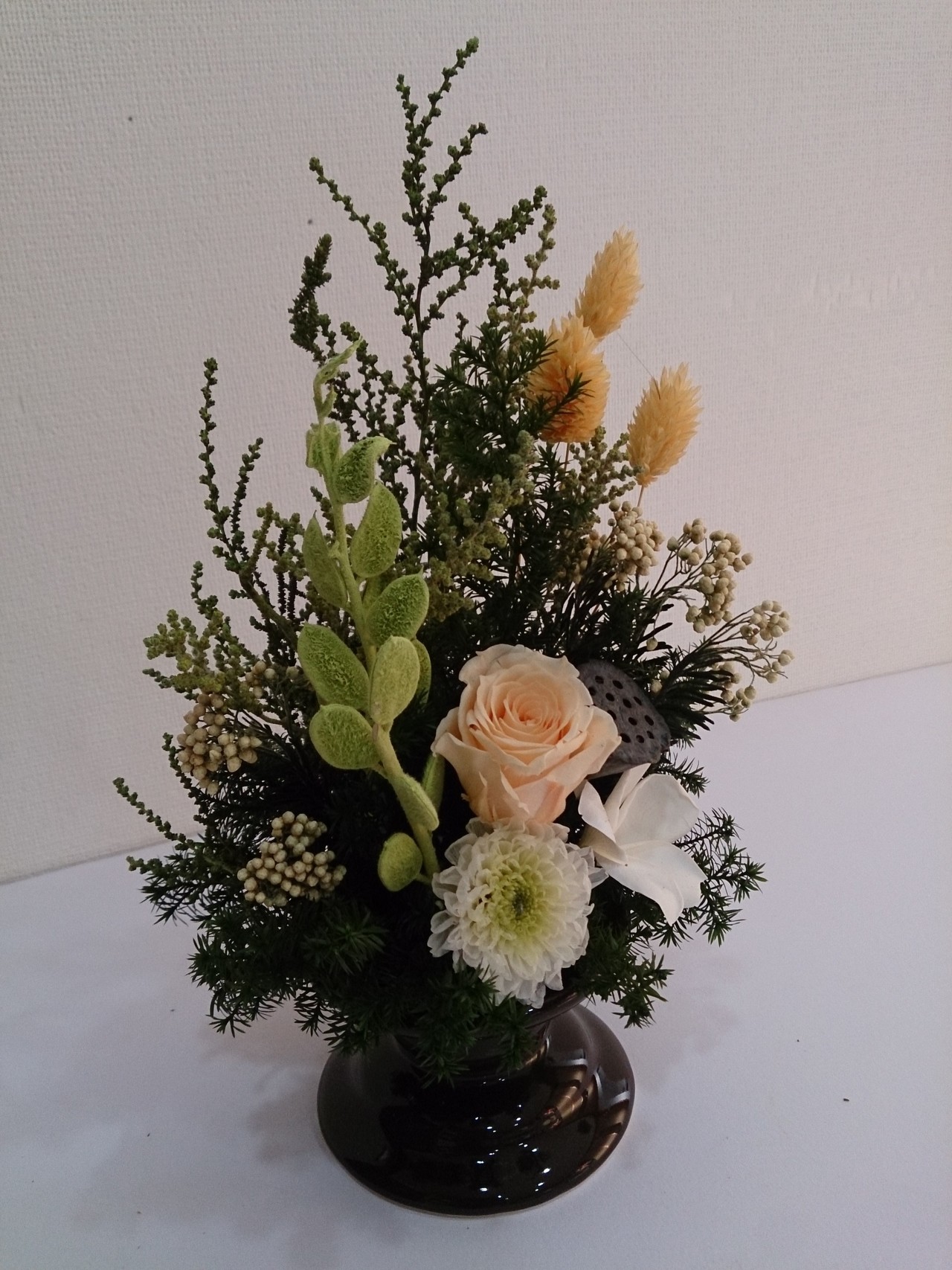1時間~1時間30分で完成するアレンジメント講座です。生花もプリザーブドフラワーもその都度多様な花材・資材でご案内させていただいております。